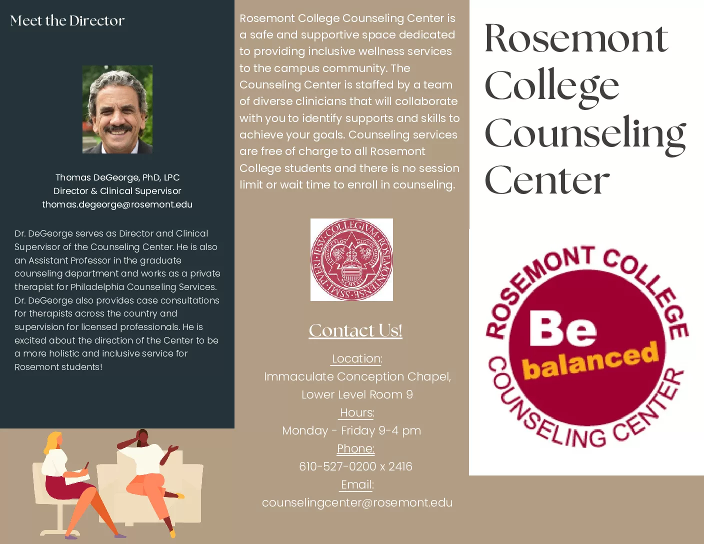 If you are interested in learning more about the Counseling Center or scheduling an appointment, please contact us by email at [email protected], by telephone at 610.527.0200 X2416, or by stopping by the Counseling Center during operating hours. If you are interested in learning more about the counseling team, please click the Be balanced image below to access the full 2 page brochure: